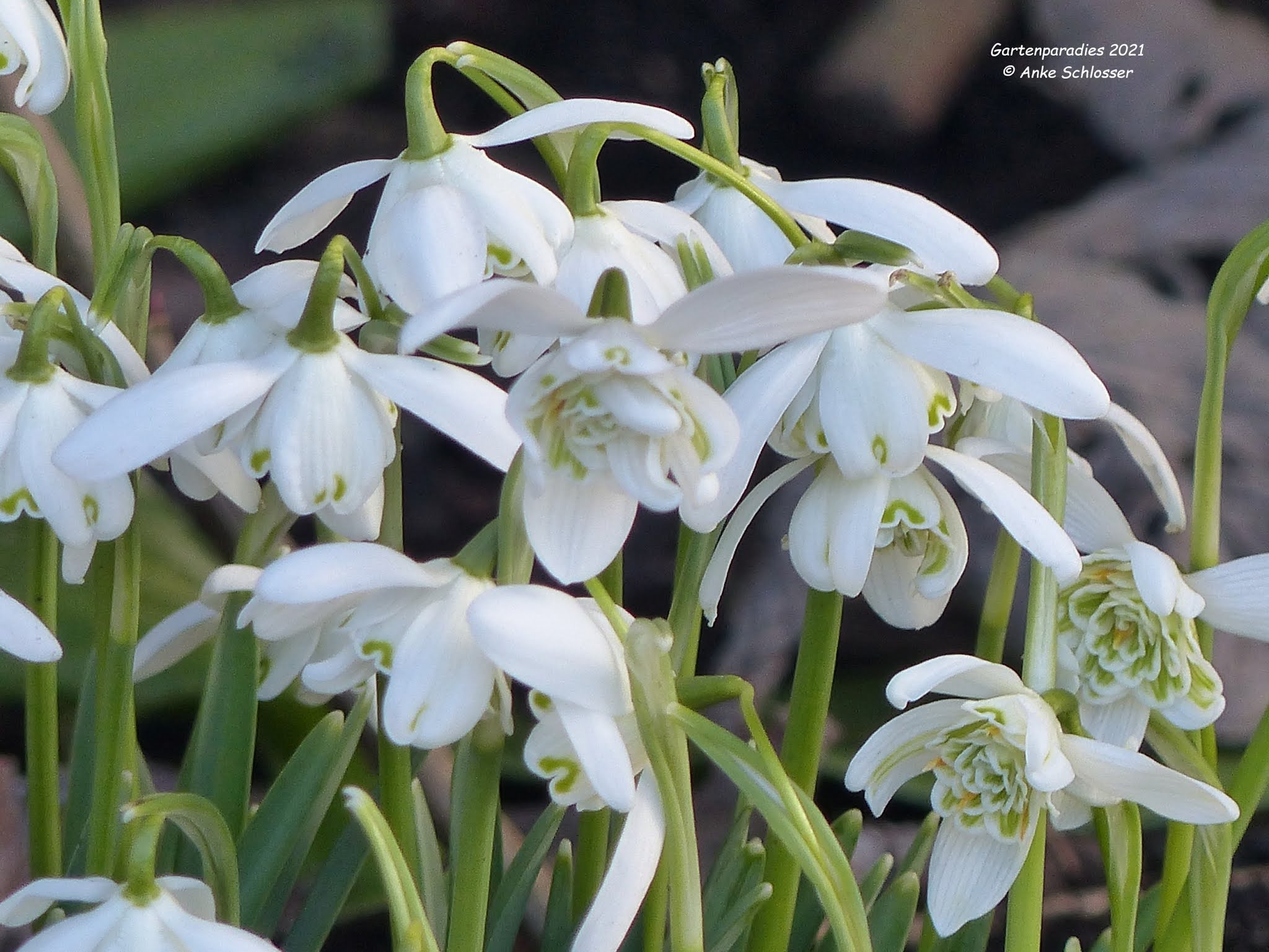 Im Garten habe ich inzwischen alle Stauden und Erfrorenes zurückgeschnitten, morgens wird man von den Vögeln geweckt und überall in den Beeten kommen die zauberhaften Schneeglöckcken (Galanthus) zum Vorschein, von den gefüllten bin ich besonders begeistert: