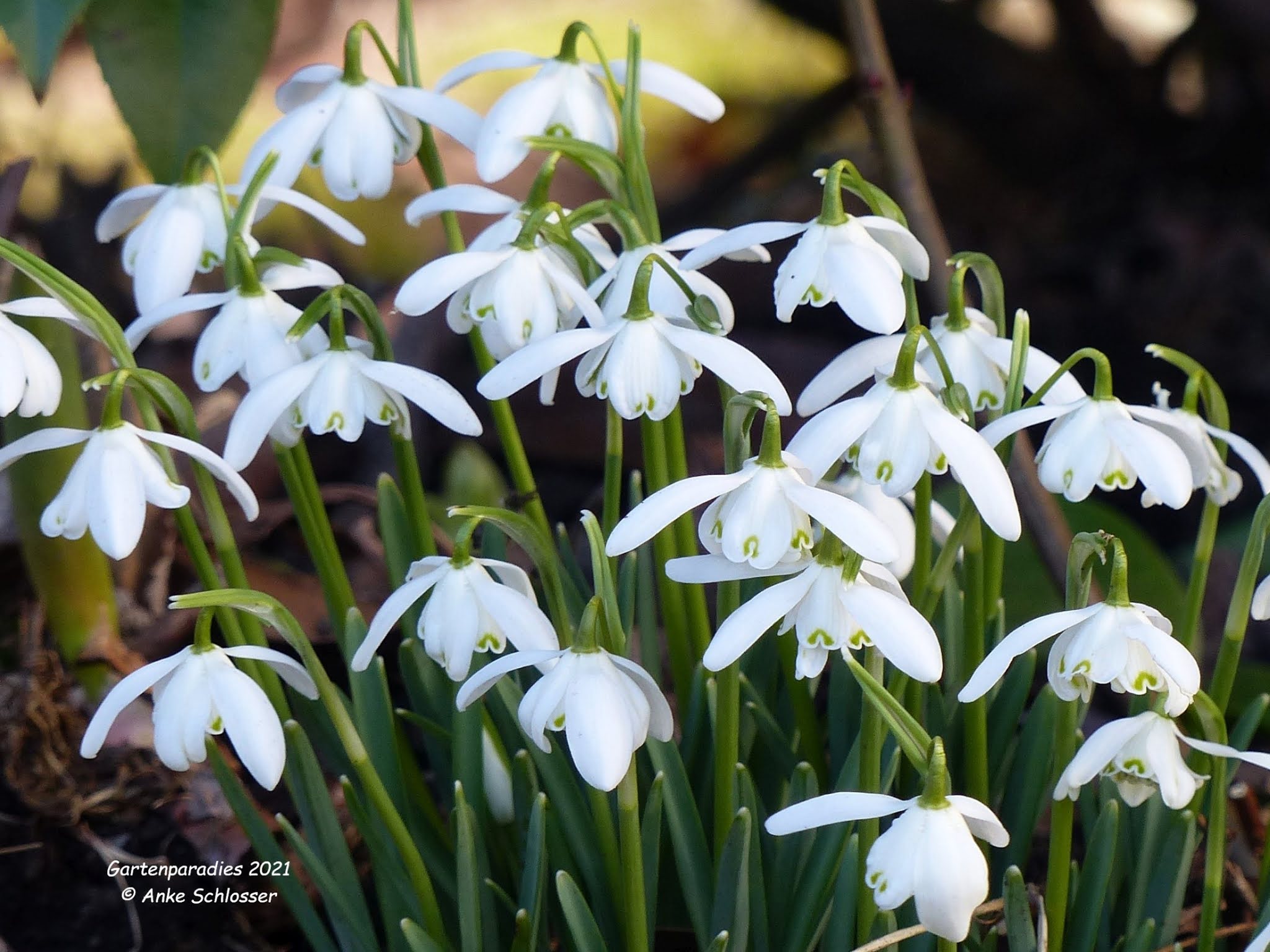 Sonntag 21. Februar 2021 gegen 11.30 Uhr: Gefüllte Schneeglöckchen (Galanthus nivalis 'Flore Pleno')